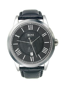 Casual watch, Japanese quartz movement, Slim polished silver-tone hands and sweep seconds, Applied polished white Roman numerals, White square markers and indices mark surrounding ornamental minute track, Analog date aperture above six o'clock, Black dial with striated inner circle and polished silver-tone logo applique, Black croc-embossed genuine leather strap with contrast stitching and polished silver-tone logo applique, Polished silver-tone stainless steel bezel, Brushed/polished silver-tone stainless steel round case, Textured steel crown with logo and black detailing, Stainless steel screw-down caseback, Water resistant