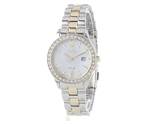 - This classic Seiko timepiece features a sleek two-tone stainless steel construction, luxe mother-of-pearl dial, and dazzling halo of Swarovski crystals.